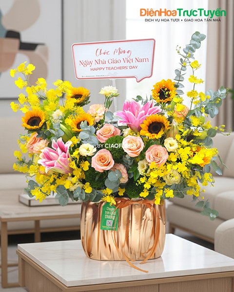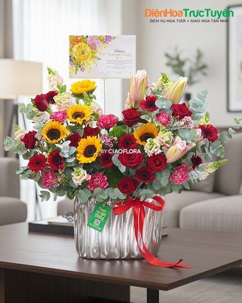 Sự pha trộn đầy ngẫu hứng nhưng hài hòa giữa Hướng Dương tỏa nắng, Hồng Đỏ nồng nàn và những bông Đồng Tiền may mắn tạo nên một nguồn năng lượng tích cực ngay từ cái nhìn đầu tiên. Đây là lựa chọn lý tưởng để gửi lời cảm ơn đến Thầy Cô, chúc mừng sinh nhật đồng nghiệp hay mang không khí tươi vui đến tiệc tân gia.