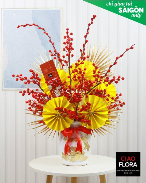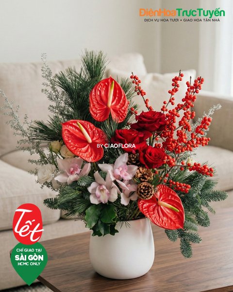 Đây là bản giao hưởng đầy tinh tế giữa sắc đỏ may mắn của Hồng Môn, vẻ đẹp kiêu sa của Địa Lan hồng và tình yêu nồng nàn từ những đóa Hoa Hồng. Điểm xuyết thêm là sự sung túc của chuỗi Đào Đông (Ilex) và nét xanh tươi vĩnh cửu của cành thông, mang cả mùa xuân an lành vào không gian sống.