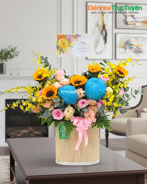 Sự giao thoa giữa sắc xanh hy vọng của Cúc Mẫu Đơn, sắc vàng rực rỡ của Hướng Dương và vẻ dịu dàng của Hồng Phấn tạo nên một tổng thể tươi vui, tràn đầy năng lượng. Đây là món quà ý nghĩa để tri ân Thầy Cô, chúc mừng Sinh nhật hay gửi gắm những lời động viên chân thành nhất.