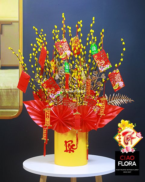 Đây là bản giao hưởng đầy tinh tế giữa sắc đỏ may mắn của Hồng Môn, vẻ đẹp kiêu sa của Địa Lan hồng và tình yêu nồng nàn từ những đóa Hoa Hồng. Điểm xuyết thêm là sự sung túc của chuỗi Đào Đông (Ilex) và nét xanh tươi vĩnh cửu của cành thông, mang cả mùa xuân an lành vào không gian sống.