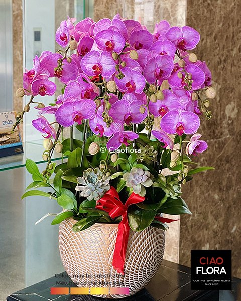 Mỗi cành lan hồ điệp bung nở rực rỡ, được cắm trong chậu sứ trắng hiện đại, điểm xuyết tinh tế bằng các cây sen đá trường thọ và nơ vàng xinh xắn, tạo nên một tác phẩm nghệ thuật đẳng cấp. Chậu lan hồ điệp 9 cành là lựa chọn hoàn hảo để tặng khai trương, chúc mừng hội nghị hoặc quà tặng cho đối tác VIP. Gửi tặng Cửu Long Hội Tụ là gửi gắm lời chúc về một sự nghiệp bền vững, thịnh vượng và một cuộc sống viên mãn, an khang.