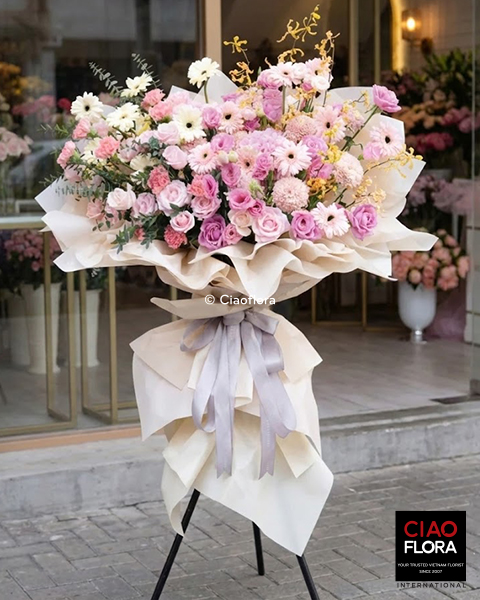 Mang làn gió tươi mới đến buổi lễ khai trương với kệ hoa phong cách Hàn Quốc (Korean Style) tông màu Pastel ngọt ngào. Sự kết hợp giữa hoa Đồng Tiền may mắn và Hoa Hồng kiêu sa tạo nên thông điệp "Vạn sự khởi đầu nan - Tương lai rực rỡ". Đây là lựa chọn tinh tế để gửi hoa chúc mừng đến Jakarta, Bali hay Surabaya.